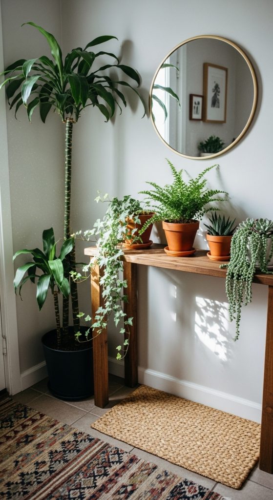 Plants bring life and freshness to any small front entryway, no matter the size. A tall, narrow plant in a decorative pot can add height without overwhelming the space, while smaller potted plants or hanging planters can decorate shelves or consoles. Greenery softens hard lines and creates a welcoming atmosphere. For low-maintenance options, choose faux plants or hardy varieties like snake plants. Adding plants not only makes the space feel more inviting but also adds personality, turning even a compact entryway into a cozy, stylish corner.
