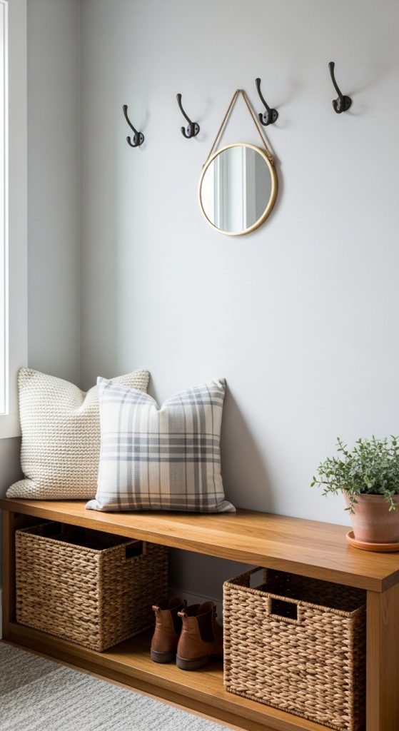 A simple yet functional small entryway idea is to add wall-mounted hooks paired with a narrow bench. This setup keeps coats, hats, and bags within reach while providing a place to sit when putting on shoes. A storage bench can also double as hidden storage for seasonal items. To elevate the look, add a cozy cushion or throw pillows for comfort and style. This approach creates an organized, welcoming entryway without taking up much floor space, making it perfect for apartments or homes with compact front entrances.