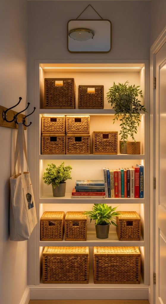 If your entryway wall has depth, consider adding built-in shelving for storage and décor. Shelves can display plants, books, and baskets for hidden storage, making the space both practical and stylish. A small built-in cubby can hold shoes or bags, keeping clutter out of sight. This idea is especially useful for small entryways where floor space is limited. By maximizing vertical storage, you create a clean, functional area that still feels decorative. Add warm lighting or sconces to highlight the shelves and make the entrance inviting.