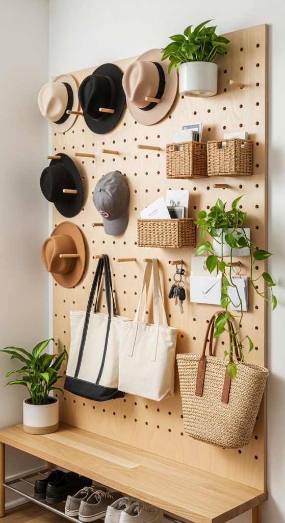 When floor space is limited, go vertical with a coat rack or peg board. This setup provides customizable storage for coats, bags, hats, or even small baskets. Peg boards can be painted to match your décor and rearranged as needed, making them both flexible and stylish. A vertical coat rack adds height to the room, making the space feel taller and more functional. This design is especially practical for small apartments where maximizing every inch counts. Add greenery or artwork nearby to keep it visually appealing.