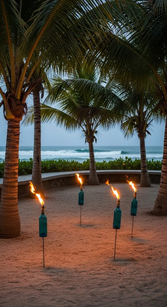 Turn empty wine bottles into outdoor tiki torches for ambient lighting. Insert a copper tube wick holder into the bottle’s mouth and fill with citronella oil. Secure the wick and decorate bottles with weather-resistant paint or twine. These torches create a tropical vibe for patios or poolside gatherings. They’re functional, repelling insects while adding rustic charm. Pair with fairy lights for enhanced evening ambiance.