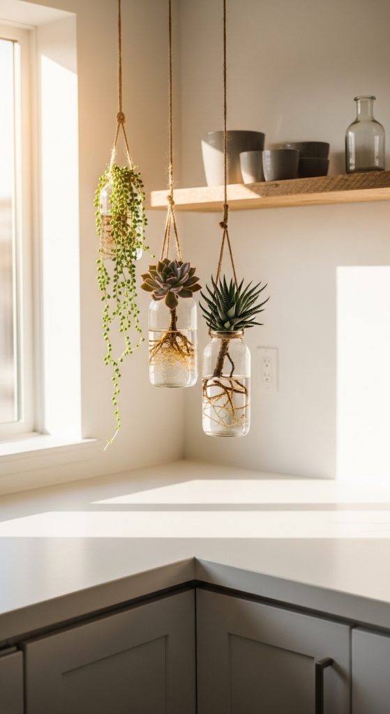 Transform glass bottles into elegant hanging planters for herbs or succulents. Clean bottles thoroughly, remove labels, and wrap twine around the neck for suspension. Use a glass cutter or opt for pre-cut bottles. Fill with soil and small plants, then hang near windows or outdoor spaces. This craft adds greenery to compact areas while showcasing roots through transparent glass. Perfect for urban gardens or bohemian decor themes.