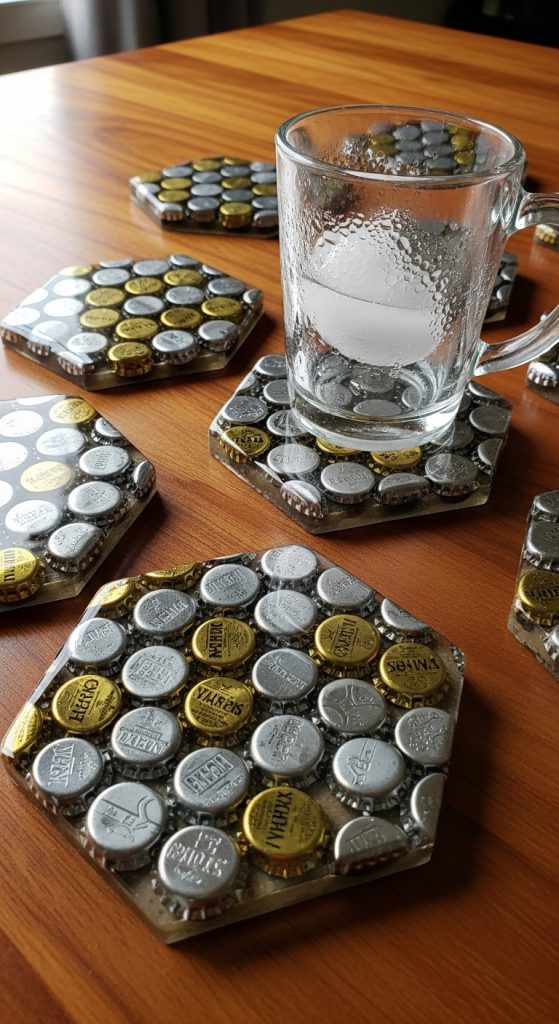 Collect metal bottle caps to craft durable coasters. Arrange caps in geometric patterns on a cork or foam base, securing them with strong glue. Seal with epoxy resin for a smooth, waterproof finish. These coasters add industrial charm to coffee tables and bars. Customize colors to match your decor—perfect for upcycling leftover caps from parties.