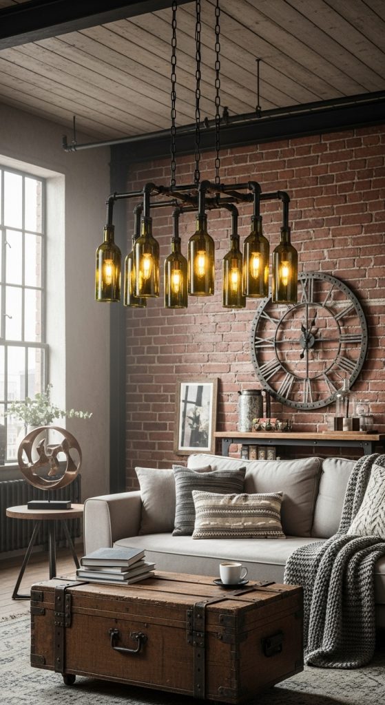 Craft a statement chandelier using glass bottles and a wooden frame. Suspend bottles upside-down with wiring kits, inserting LED string lights into each neck. Use colored bottles for a stained-glass effect. This project suits dining areas or garden spaces, blending industrial and artistic elements. Ensure bottles are securely fastened for safety.