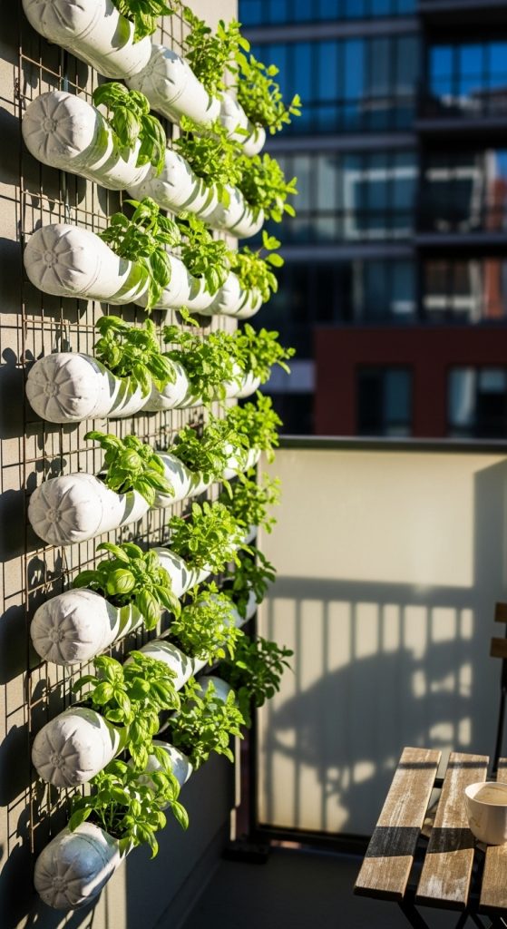 Build a space-saving vertical garden using cut plastic bottles. Attach bottles horizontally to a trellis or wall, filling each with soil and plants like herbs or strawberries. Ensure drainage holes at the bottom. This system maximizes small balconies or urban gardens, promoting efficient water use. Paint exteriors for a cohesive aesthetic.