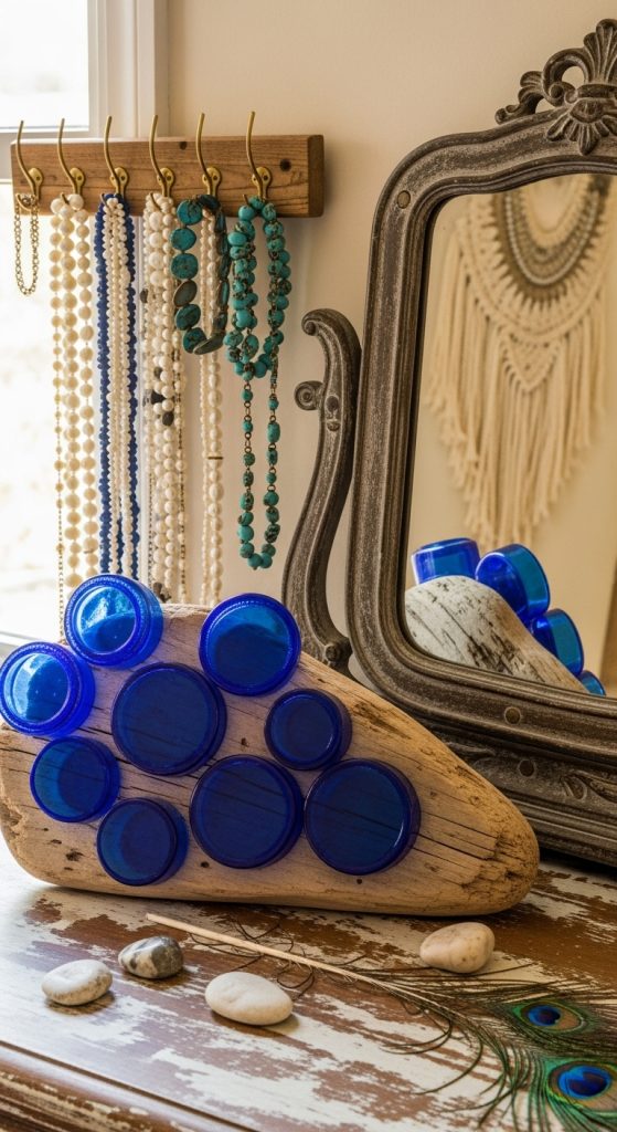 Design unique jewelry organizers using sliced bottle bottoms. Sand edges smooth and mount on wooden boards with hooks. Hang necklaces or bracelets from the hooks, storing rings in the curved glass compartments. Add metallic accents for a glamorous touch. Perfect for decluttering dressers with artistic flair.