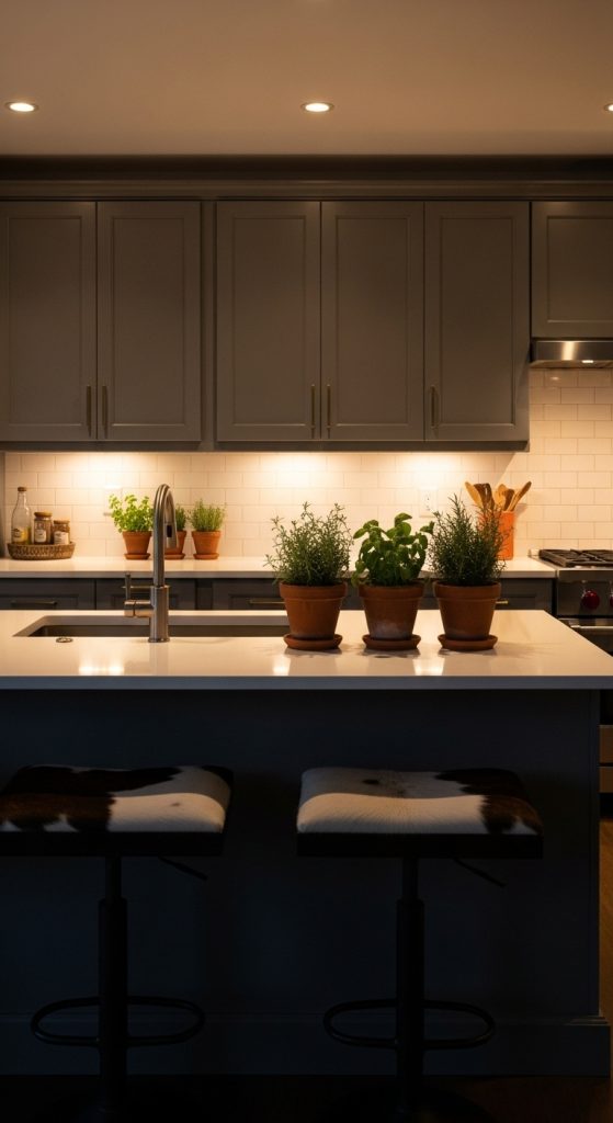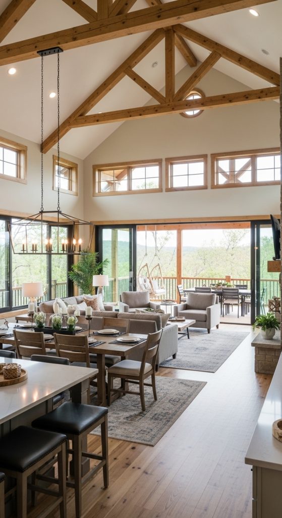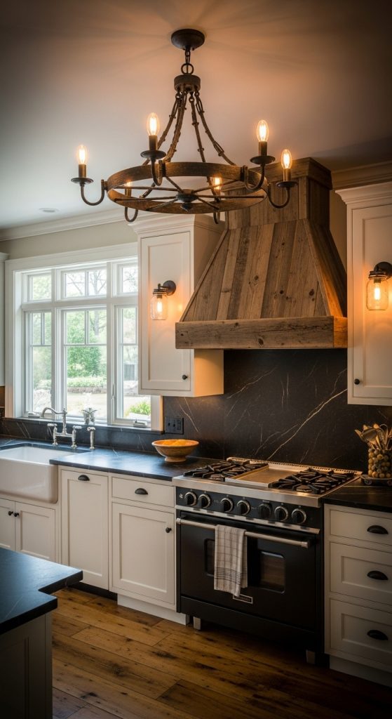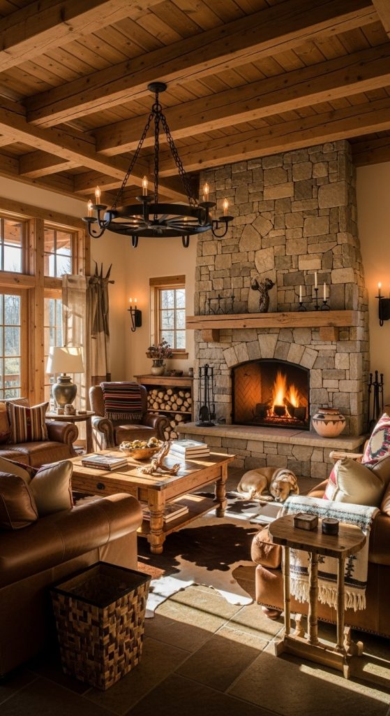 Opt for lantern-style pendants, antler chandeliers, or barn-inspired sconces. Dimmable lighting enhances the cozy evening atmosphere. Copper or bronze finishes complement earthy palettes.