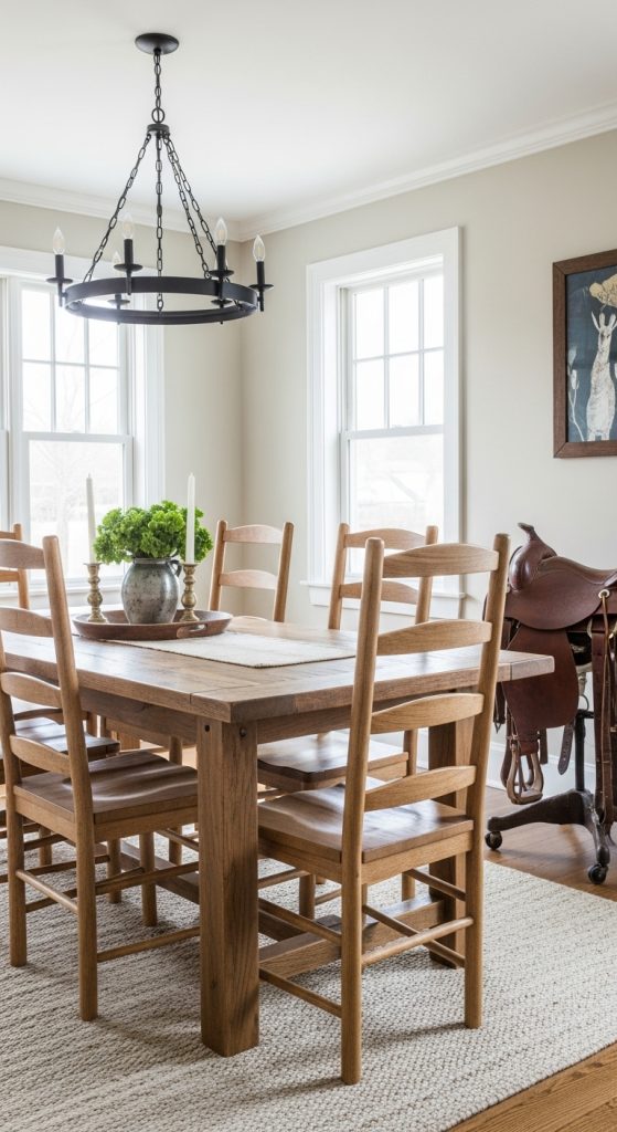 Subtle nods to ranching history personalize the space. Display items like stirrups, horseshoes, or antique lanterns sparingly to avoid cluttering the minimalist ethos.