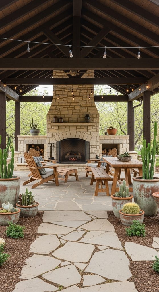 Extend the ranch aesthetic to porches, patios, and gardens. Use weather-resistant materials like teak, galvanized metal, and stone. Add rustic touches like horse tie rings, wagon-wheel decor, or wrought-iron lanterns.