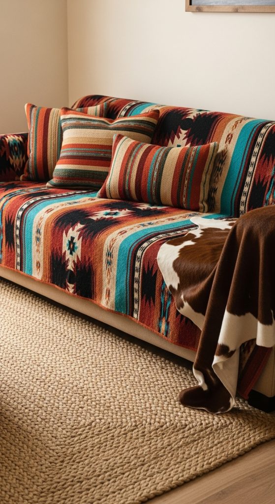 Incorporate Southwestern motifs like geometric prints, tribal stripes, or cowboy-themed embroidery. Natural fabrics like wool, cotton, and jute add texture while maintaining comfort.